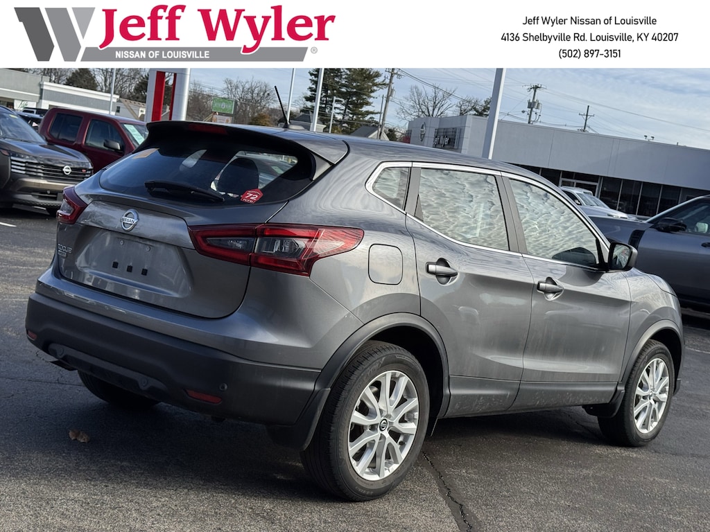 Jeff Wyler Nissan of Louisville is pumped up to offer this stunning 2022 Nissan Rogue Sport S in Gun Metallic. ** BALANCE OF FACTORY WARRANTY **, ** NISSAN CERTIFIED PRE-OWNED **, ** ONE-OWNER CARFAX **, ** CLEAN CARFAX REPORT **, ** BLUETOOTH **, ** BACKUP CAMERA **, ** EXCELLENT SERVICE HISTORY **, ** LOCALLY OWNED **, and ** HOME DELIVERY OPTIONS! ** 1-Piece Carpeted Cargo Area Protector & Floor Mats, 4 Speakers, 4-Wheel Disc Brakes, 6.39 Axle Ratio, ABS brakes, Air Conditioning, Alloy wheels, AM/FM radio: SiriusXM, Auto High-beam Headlights, Blind Spot Warning, Brake assist, Bumpers: body-color, CD player, Cloth Seat Trim, Delay-off headlights, Driver door bin, Driver vanity mirror, Dual front impact airbags, Dual front side impact airbags, Electronic Stability Control, First Aid Kit, Four wheel independent suspension, Front anti-roll bar, Front Bucket Seats, Front Center Armrest, Front reading lights, Fully automatic headlights, Illuminated entry, Knee airbag, Low tire pressure warning, NissanConnect featuring Apple CarPlay and Android Auto, Occupant sensing airbag, Outside temperature display, Overhead airbag, Overhead console, Panic alarm, Passenger door bin, Passenger vanity mirror, Power door mirrors, Power steering, Power windows, Radio data system, Radio: AM/FM NissanConnect, Rear anti-roll bar, Rear Parking Sensors, Rear seat center armrest, Rear side impact airbag, Rear window defroster, Rear window wiper, Remote keyless entry, Security system, Speed control, Speed-sensing steering, Speed-Sensitive Wipers, Splash Guards, Split folding rear seat, Spoiler, Steering wheel mounted audio controls, Tachometer, Telescoping steering wheel, Tilt steering wheel, Traction control, Trip computer, Variably intermittent wipers, and Wheels: 17" x 7.0" Aluminum Alloy Our PRE-OWNED vehicles are put through a rigorous 167- POINT QUALITY ASSURANCE INSPECTION along with an average amount of over $1,400.00 SPENT to recondition each vehicle so we can be sure to deliver you the highest quality vehicle like you deserve! ***ONLINE PRICE DOES NOT INCLUDE WYLER FAMILY FIRST PACKAGE*** Stop by 4136 Shelbyville Road to see for yourself, or give us a call @ 502-897-3151 to schedule your test drive! ** BALANCE OF FACTORY WARRANTY **, ** NISSAN CERTIFIED PRE-OWNED **, ** ONE-OWNER CARFAX **, ** CLEAN CARFAX REPORT **, ** BLUETOOTH **, ** BACKUP CAMERA **, ** EXCELLENT SERVICE HISTORY **, ** LOCALLY OWNED **.