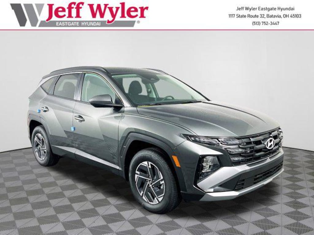 Amazon Gray 2025 Hyundai Tucson Hybrid Blue 1.6L I4 DGI Hybrid Turbocharged DOHC 16V LEV3-SULEV30 AWD 6-Speed Automatic 38/38 City/Highway MPG Jeff Wyler Eastgate Auto Mall is excited to offer this beautiful 2025 Hyundai Tucson Hybrid Blue in Amazon Gray. Well equipped with: Option Group 01, 17" Alloy Wheels, 4-Wheel Disc Brakes, 6 Speakers, ABS brakes, Air Conditioning, Alloy wheels, AM/FM radio: SiriusXM, Apple CarPlay & Android Auto, Auto High-beam Headlights, Automatic temperature control, Brake assist, Bumpers: body-color, Cargo Cover, Cargo Net, Cargo Tray, Carpeted Floor Mats, Delay-off headlights, Driver door bin, Driver vanity mirror, Dual front impact airbags, Dual front side impact airbags, Electronic Stability Control, Emergency communication system: Bluelink+, First Aid Kit, Four wheel independent suspension, Front anti-roll bar, Front Bucket Seats, Front Center Armrest, Front dual zone A/C, Front reading lights, Fully automatic headlights, Heated door mirrors, Heated Front Bucket Seats, Heated front seats, Illuminated entry, Low tire pressure warning, Mud Guards, Occupant sensing airbag, Outside temperature display, Overhead airbag, Overhead console, Panic alarm, Passenger door bin, Passenger vanity mirror, Power door mirrors, Power driver seat, Power Liftgate, Power steering, Power windows, Radio data system, Radio: AM/FM/HD Audio System, Rear anti-roll bar, Rear reading lights, Rear seat center armrest, Rear side impact airbag, Rear window defroster, Rear window wiper, Remote keyless entry, Roadside Assistance Kit, Security system, Speed control, Split folding rear seat, Spoiler, Stain & Odor Resistant Cloth Seat Trim, Steering wheel mounted audio controls, Tachometer, Telescoping steering wheel, Tilt steering wheel, Traction control, Trip computer, and Variably intermittent wipers. 38/38 City/Highway MPG