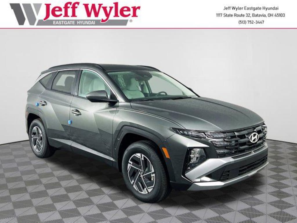 Amazon Gray 2025 Hyundai Tucson Hybrid Blue 1.6L I4 DGI Hybrid Turbocharged DOHC 16V LEV3-SULEV30 AWD 6-Speed Automatic 38/38 City/Highway MPG Jeff Wyler Eastgate Auto Mall is pleased to offer this beautiful 2025 Hyundai Tucson Hybrid Blue in Amazon Gray. Well equipped with: Option Group 01, 17" Alloy Wheels, 4-Wheel Disc Brakes, 6 Speakers, ABS brakes, Air Conditioning, Alloy wheels, AM/FM radio: SiriusXM, Apple CarPlay & Android Auto, Auto High-beam Headlights, Automatic temperature control, Brake assist, Bumpers: body-color, Cargo Cover, Cargo Net, Cargo Tray, Carpeted Floor Mats, Delay-off headlights, Driver door bin, Driver vanity mirror, Dual front impact airbags, Dual front side impact airbags, Electronic Stability Control, Emergency communication system: Bluelink+, First Aid Kit, Four wheel independent suspension, Front anti-roll bar, Front Bucket Seats, Front Center Armrest, Front dual zone A/C, Front reading lights, Fully automatic headlights, Heated door mirrors, Heated Front Bucket Seats, Heated front seats, Illuminated entry, Low tire pressure warning, Mud Guards, Occupant sensing airbag, Outside temperature display, Overhead airbag, Overhead console, Panic alarm, Passenger door bin, Passenger vanity mirror, Power door mirrors, Power driver seat, Power Liftgate, Power steering, Power windows, Radio data system, Radio: AM/FM/HD Audio System, Rear anti-roll bar, Rear reading lights, Rear seat center armrest, Rear side impact airbag, Rear window defroster, Rear window wiper, Remote keyless entry, Roadside Assistance Kit, Security system, Speed control, Split folding rear seat, Spoiler, Stain & Odor Resistant Cloth Seat Trim, Steering wheel mounted audio controls, Tachometer, Telescoping steering wheel, Tilt steering wheel, Traction control, Trip computer, and Variably intermittent wipers. 38/38 City/Highway MPG