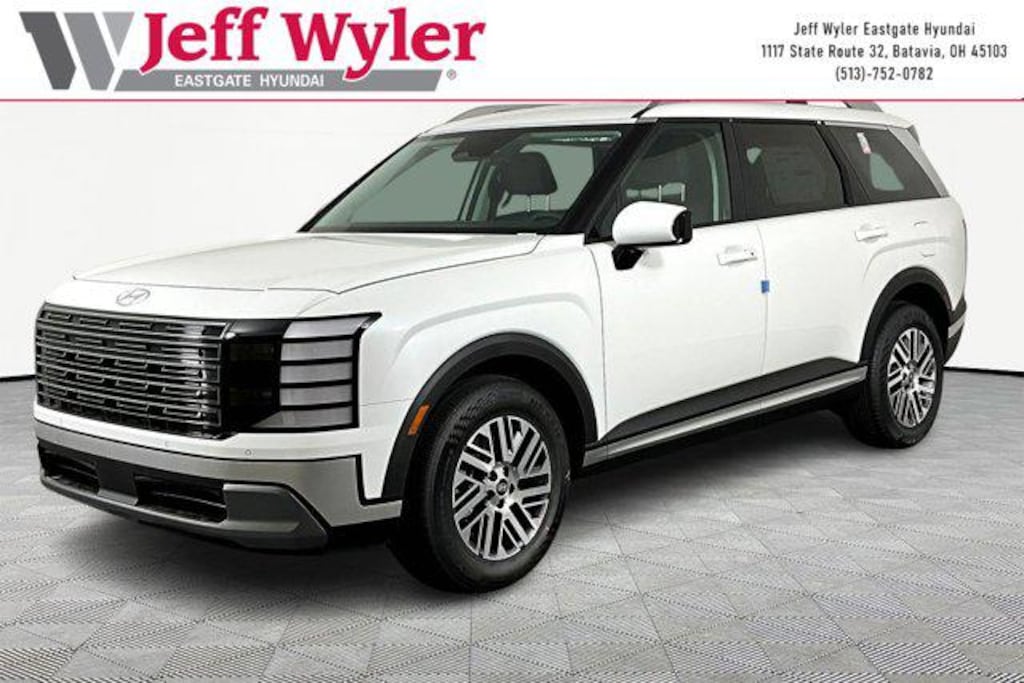 Creamy White Pearl 2026 Hyundai Palisade SEL 7 Passenger V6 AWD 8-Speed Automatic 18/24 City/Highway MPG Jeff Wyler Eastgate Auto Mall is proud to offer this terrific 2026 Hyundai Palisade SEL in Creamy White Pearl. Well equipped with: Option Group 01, 3rd row seats: split-bench, 4-Wheel Disc Brakes, 8 Speakers, ABS brakes, Air Conditioning, Alloy wheels, AM/FM radio: SiriusXM, Apple CarPlay & Android Auto, Auto High-beam Headlights, Auto-dimming Rear-View mirror, Auto-leveling suspension, Automatic temperature control, Brake assist, Bumpers: body-color, Cargo Cover, Cargo Mat, Up Seatback, Cargo Net, Carpeted Floor Mats, Compass, Delay-off headlights, Driver door bin, Driver vanity mirror, Dual front impact airbags, Dual front side impact airbags, Electronic Stability Control, Emergency communication system: None, Exterior Parking Camera Rear, First Aid Kit, Four wheel independent suspension, Front anti-roll bar, Front Bucket Seats, Front Center Armrest, Front dual zone A/C, Front reading lights, Fully automatic headlights, H-Tex Leatherette Seat Trim, Heated door mirrors, Heated Front Bucket Seats, Heated front seats, Illuminated entry, Knee airbag, Leather steering wheel, Low tire pressure warning, Navigation System, Occupant sensing airbag, Outside temperature display, Overhead airbag, Overhead console, Panic alarm, Passenger door bin, Passenger vanity mirror, Power door mirrors, Power driver seat, Power Liftgate, Power steering, Power windows, Radio data system, Radio: Infotainment Navigation System, Rear air conditioning, Rear anti-roll bar, Rear audio controls, Rear reading lights, Rear side impact airbag, Rear window defroster, Rear window wiper, Reclining 3rd row seat, Remote keyless entry, Security system, Speed control, Split folding rear seat, Spoiler, Steering wheel mounted audio controls, Tachometer, Telescoping steering wheel, Tilt steering wheel, Traction control, Trip computer, Turn signal indicator mirrors, Variably intermittent wipers, and Wheels: 18" x 8.0J Alloy.