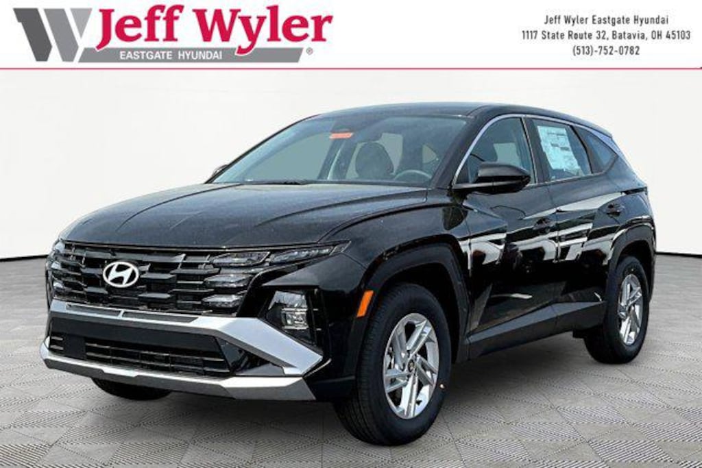 Phantom Black 2026 Hyundai Tucson SE 2.5L I4 DGI DOHC 16V LEV3-SULEV30 187hp AWD 8-Speed Automatic with SHIFTRONIC 24/30 City/Highway MPG Jeff Wyler Eastgate Auto Mall is pleased to offer this charming 2026 Hyundai Tucson SE in Phantom Black. Well equipped with: Option Group 01, 17" x 7.0J Alloy Wheels, 4-Wheel Disc Brakes, 6 Speakers, ABS brakes, Air Conditioning, Alloy wheels, AM/FM radio: SiriusXM, Apple CarPlay & Android Auto, Auto High-beam Headlights, Brake assist, Bumpers: body-color, Cargo Net, Carpeted Floor Mats, Cloth Seat Trim, Delay-off headlights, Driver door bin, Driver vanity mirror, Dual front impact airbags, Dual front side impact airbags, Electronic Stability Control, Emergency communication system: None, Four wheel independent suspension, Front anti-roll bar, Front Bucket Seats, Front Center Armrest, Front reading lights, Fully automatic headlights, Illuminated entry, Low tire pressure warning, Occupant sensing airbag, Outside temperature display, Overhead airbag, Overhead console, Panic alarm, Passenger door bin, Passenger vanity mirror, Power door mirrors, Power steering, Power windows, Radio data system, Radio: AM/FM/HD Audio System, Rear anti-roll bar, Rear reading lights, Rear seat center armrest, Rear side impact airbag, Rear window defroster, Rear window wiper, Remote keyless entry, Security system, Speed control, Split folding rear seat, Spoiler, Steering wheel mounted audio controls, Tachometer, Telescoping steering wheel, Tilt steering wheel, Traction control, Trip computer, and Variably intermittent wipers. 24/30 City/Highway MPG