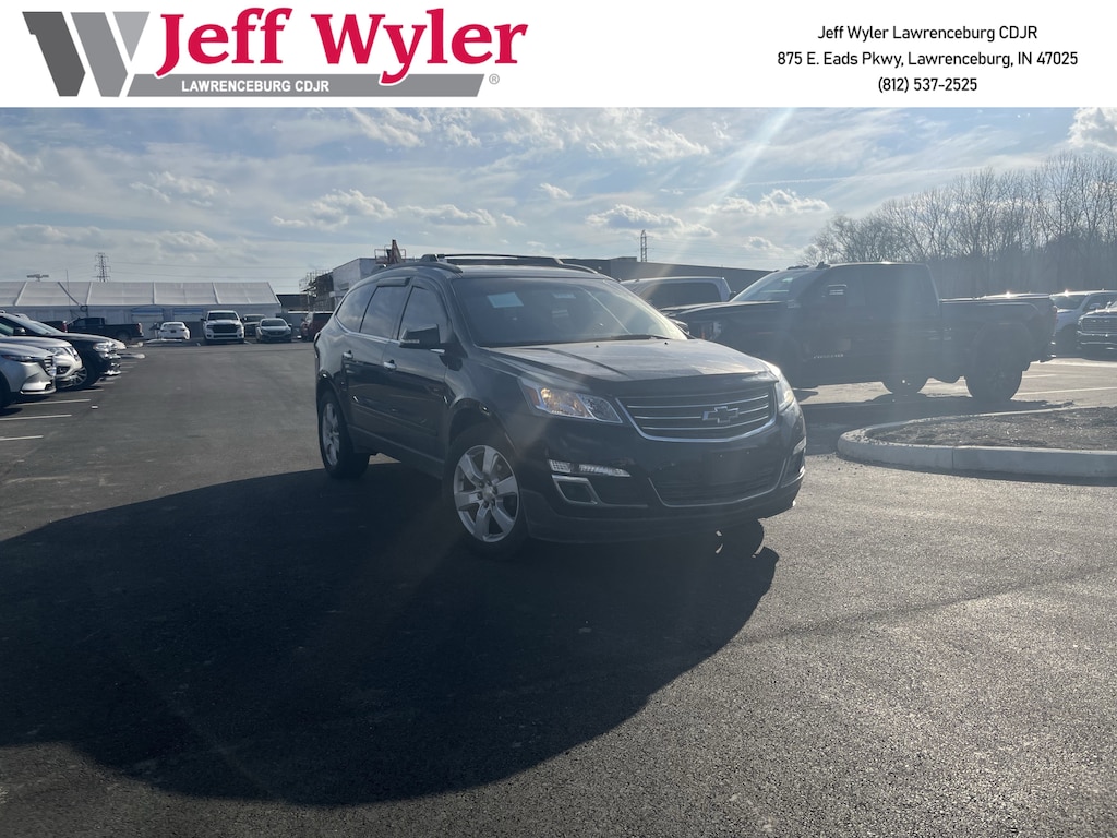 Jeff Wyler Chrysler Dodge Jeep of Lawrenceburg is proud to offer this wonderful 2017 Chevrolet Traverse LT in Mosaic Black Metallic. Front License Plate Bracket Mounting Package, Preferred Equipment Group 1LT (8-Way Power Driver Seat w/Power Lumbar, Bluetooth® For Phone, Body-Color Bodyside Moldings, Body-Color Heated Power-Adjustable Outside Mirrors, Enhanced Driver Information Center, Front Fog Lamps, Frontal & Side-Impact Airbags, Interior Wood Grain Center Stack & Interior Trim, Leather-Wrapped Steering Wheel, Rear Park Assist, Remote Vehicle Start, and Standard Speaker System), Style & Technology Package (Heated Driver & Front Passenger Seats, Radio: Chevrolet MyLink AM/FM Stereo w/CD Player, SiriusXM Satellite Radio, Universal Home Remote, Variable Effort Power Steering, and Wheels: 20" x 7.5" Painted Aluminum (4)), Trailering Equipment (Heavy-Duty Cooling System and Trailer Hitch), AWD, 18" x 7.5" Machined Aluminum Wheels, 3.16 Axle Ratio, 3rd row seats: split-bench, 4-Wheel Disc Brakes, 6 Speakers, 7-Passenger Seating (2-2-3 Seating Configuration), 8-Passenger Seating (2-3-3 Seating Configuration), ABS brakes, Air Conditioning, Alloy wheels, AM/FM radio: SiriusXM, Bodyside moldings, Brake assist, Bumpers: body-color, CD player, Compass, Delay-off headlights, Driver door bin, Driver vanity mirror, Dual front impact airbags, Dual front side impact airbags, Electronic Stability Control, Emergency communication system, Exterior Parking Camera Rear, Four wheel independent suspension, Front & Rear Black Bowtie Emblems (LPO), Front anti-roll bar, Front Bucket Seats, Front Center Armrest w/Storage, Front fog lights, Front reading lights, Fully automatic headlights, Heated door mirrors, Illuminated entry, Low tire pressure warning, Occupant sensing airbag, Outside temperature display, Overhead airbag, Panic alarm, Passenger door bin, Passenger vanity mirror, Power door mirrors, Power driver seat, Power steering, Power windows, Premium Cloth Seat Trim, Radio data system, Radio: Color Touch AM/FM/SiriusXM/CD Player, Rear air conditioning, Rear anti-roll bar, Rear reading lights, Rear seat center armrest, Rear window defroster, Rear window wiper, Remote keyless entry, Roof Rack Longitudinal C-Channels&Cross Rails (LPO), Roof rack: rails only, Security system, Speed control, Split folding rear seat, Spoiler, Steering wheel mounted audio controls, Tachometer, Telescoping steering wheel, Tilt steering wheel, Traction control, Trip computer, Turn signal indicator mirrors, Variably intermittent wipers, and Voltmeter Our PRE-OWNED vehicles are put through a rigorous 167- POINT QUALITY ASSURANCE INSPECTION along with an average amount of over $1,400.00 SPENT to recondition each vehicle so we can be sure to deliver you the highest quality vehicle like you deserve! ***ONLINE PRICE DOES NOT INCLUDE WYLER FAMILY FIRST PACKAGE*** Stop by 4136 Shelbyville Road to see for yourself, or give us a call @ 502-897-3151 to schedule your test drive! Ask about available certifications.