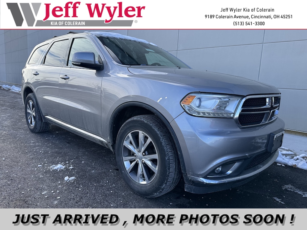 Jeff Wyler Kia of Colerain is excited to offer this charming 2016 Dodge Durango Limited in Billet Silver Metallic Clearcoat. Nav & Power Liftgate Group (GPS Navigation, HD Radio, Power Liftgate, and Radio: Uconnect 8.4 NAV), Quick Order Package 23E, 3.45 Rear Axle Ratio, 3rd row seats: split-bench, 4-Wheel Disc Brakes, 6 Speakers, 8.4" Touchscreen Display, ABS brakes, Air Conditioning, Alloy wheels, AM/FM radio: SiriusXM, Anti-whiplash front head restraints, Audio memory, Auto-dimming door mirrors, Auto-dimming Rear-View mirror, Automatic temperature control, Brake assist, Bumpers: body-color, Compass, Delay-off headlights, Driver door bin, Driver vanity mirror, Dual front impact airbags, Dual front side impact airbags, Electronic Stability Control, Emergency communication system, Exterior Parking Camera Rear, Four wheel independent suspension, Front anti-roll bar, Front Bucket Seats, Front Center Armrest w/Storage, Front dual zone A/C, Front fog lights, Front reading lights, Fully automatic headlights, Garage door transmitter, GPS Antenna Input, Heated door mirrors, Heated front seats, Heated rear seats, Heated steering wheel, Illuminated entry, Integrated Voice Command w/Bluetooth, Knee airbag, Leather Trimmed Bucket Seats, Low tire pressure warning, Manufacturer's Statement of Origin, Memory seat, Nav-Capable! See Dealer for Details, Occupant sensing airbag, Outside temperature display, Overhead airbag, Overhead console, Panic alarm, Passenger door bin, Passenger vanity mirror, Power door mirrors, Power driver seat, Power passenger seat, Power steering, Power windows, Radio data system, Radio: Uconnect 8.4, Rear air conditioning, Rear anti-roll bar, Rear Parking Sensors, Rear reading lights, Rear seat center armrest, Rear window defroster, Rear window wiper, Remote keyless entry, Roadside Assistance & 9-1-1 Call, Roof rack, Security system, SiriusXM Satellite Radio, Speed control, Speed-Sensitive Wipers, Split folding rear seat, Spoiler, Steering wheel mounted audio controls, Tachometer, Telescoping steering wheel, Tilt steering wheel, Traction control, Trip computer, Turn signal indicator mirrors, Variably intermittent wipers, and Wheels: 18" x 8.0" Polished Aluminum Our PRE-OWNED vehicles are put through a rigorous 167- POINT QUALITY ASSURANCE INSPECTION along with an average amount of over $1,400.00 SPENT to recondition each vehicle so we can be sure to deliver you the highest quality vehicle like you deserve! ***ONLINE PRICE DOES NOT INCLUDE WYLER FAMILY FIRST PACKAGE***