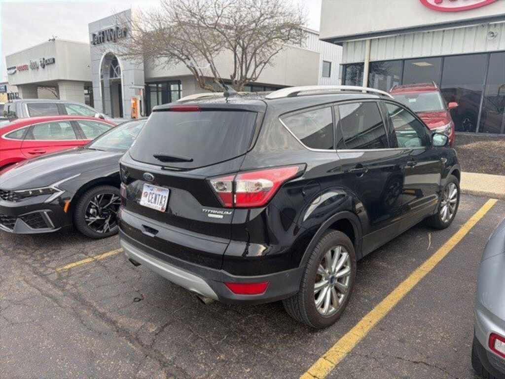 Jeff Wyler Springfield Auto Mall is pleased to offer this fantastic-looking 2018 Ford Escape Titanium in Shadow Black. Well equipped with: Equipment Group 400A, 10 Speakers, 3.07 Axle Ratio, 4-Wheel Disc Brakes, ABS brakes, Air Conditioning, Alloy wheels, AM/FM radio: SiriusXM, AppLink/Apple CarPlay and Android Auto, Auto-dimming Rear-View mirror, Automatic temperature control, Brake assist, Bumpers: body-color, CD player, Compass, Delay-off headlights, Driver door bin, Driver vanity mirror, Dual front impact airbags, Dual front side impact airbags, Electronic Stability Control, Emergency communication system: SYNC 3 911 Assist, Exterior Parking Camera Rear, Four wheel independent suspension, Front anti-roll bar, Front Bucket Seats, Front Center Armrest, Front dual zone A/C, Front fog lights, Front reading lights, Fully automatic headlights, Garage door transmitter, Heated door mirrors, Heated front seats, Heated Leather-Trimmed Front Bucket Seats, Heated steering wheel, High-Intensity Discharge Headlights, Illuminated entry, Knee airbag, Leather Shift Knob, Low tire pressure warning, Memory seat, Navigation System, Occupant sensing airbag, Outside temperature display, Overhead airbag, Overhead console, Panic alarm, Passenger door bin, Passenger vanity mirror, Power door mirrors, Power driver seat, Power Liftgate, Power passenger seat, Power steering, Power windows, Radio data system, Radio: AM/FM Stereo w/Single-CD/MP3 Player, Rear anti-roll bar, Rear reading lights, Rear seat center armrest, Rear window defroster, Rear window wiper, Remote keyless entry, Roof rack: rails only, Security system, Speed control, Speed-sensing steering, Split folding rear seat, Steering wheel mounted audio controls, SYNC 3 Communications & Entertainment System, SYNC Connect, Tachometer, Telescoping steering wheel, Tilt steering wheel, Traction control, Trip computer, Turn signal indicator mirrors, Variably intermittent wipers, Voice-Activated Touchscreen Navigation System, and Wheels: 18" Sparkle Silver-Painted Aluminum. Awards: * 2018 KBB.com 10 Most Awarded Brands * 2018 KBB.com Brand Image Awards Ask about available certifications. Used vehicles 10 years of age or newer with less than 100,000 miles are eligible for the Wyler Assurance Program, but eligible vehicles must pass our reconditioning process and multi-point inspection. Provided the vehicle passes inspection, vehicles will be eligible for the 6 month/6,000 mile limited warranty. The 6 month/6,000 mile limited warranty is NOT available on AS-IS vehicles, wholesale vehicles, lease buyback/pass-thru vehicles or un-inspected vehicles. Note that this program can also apply to vehicles where the remaining factory coverage is less than 6 months or 6,000 miles. Please check the Federal Trade Commission (FTC) Buyers guide on the vehicle for full details as to whether or not warranty coverage may apply. Contact Dealer for additional details. The Wyler Assurance 6 month/6,000 Mile limited warranty ends 6 months from the date of the Retail Purchase Agreement (BUYERS ORDER) or when the vehicle's odometer registers 6,000 additional miles to the mileage listed on the BUYERS ORDER, whichever comes first. Your Deductible - The warranty holder on your contract pays the first $100 of each covered repair.