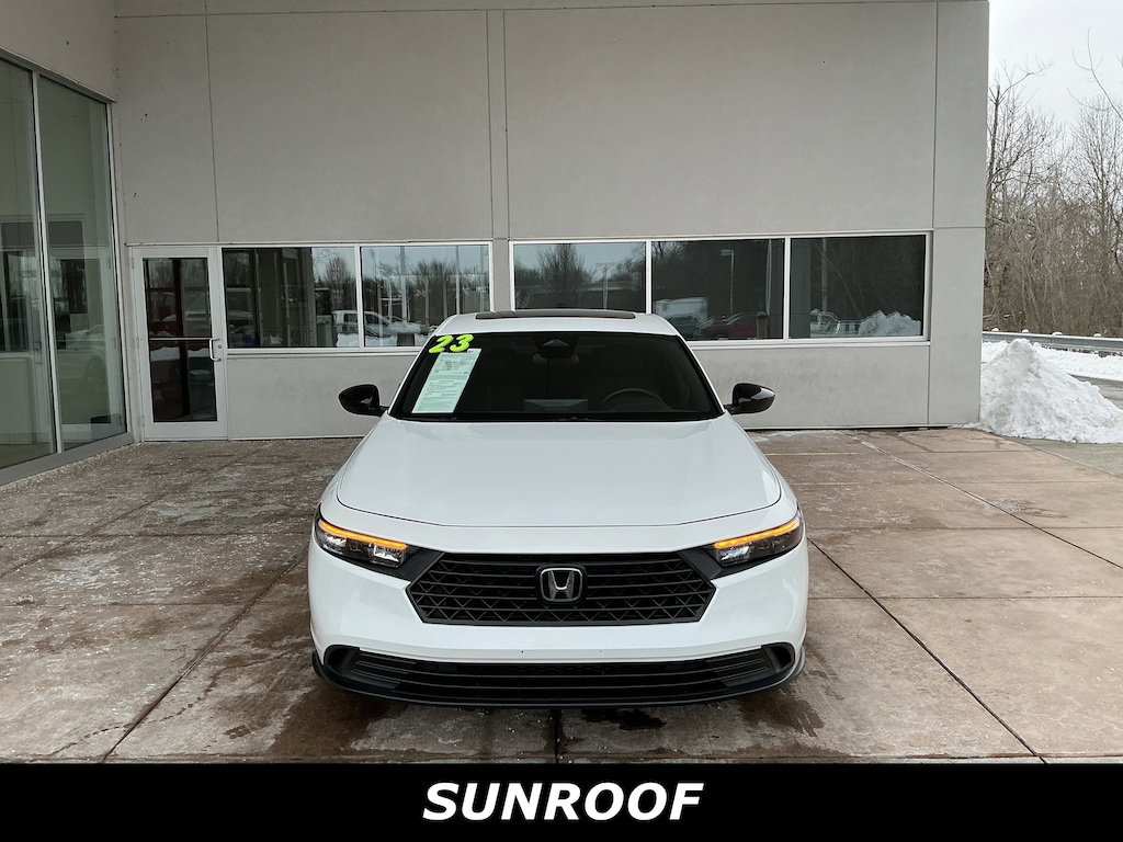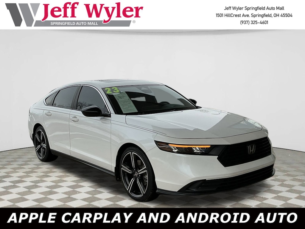 Jeff Wyler Springfield Auto Mall is pumped up to offer this good-looking 2023 Honda Accord Hybrid Sport in White. Well equipped with: 4-Wheel Disc Brakes, 8 Speakers, ABS brakes, Adaptive Cruise Control: Adaptive Cruise Control (ACC) with Low-Speed Follow, Air Conditioning, Alloy wheels, AM/FM radio, Apple CarPlay/Android Auto, Auto High-beam Headlights, Automatic temperature control, Brake assist, Bumpers: body-color, Compass, Delay-off headlights, Driver door bin, Driver vanity mirror, Dual front impact airbags, Dual front side impact airbags, Electronic Stability Control, Emergency communication system: HondaLink, Exterior Parking Camera Rear, Fabric Seat Trim, Four wheel independent suspension, Front anti-roll bar, Front Bucket Seats, Front Center Armrest, Front dual zone A/C, Front reading lights, Fully automatic headlights, Illuminated entry, Knee airbag, Lane departure: Lane Keeping Assist System (LKAS) active, Leather Shift Knob, Leather steering wheel, Low tire pressure warning, Occupant sensing airbag, Outside temperature display, Overhead airbag, Overhead console, Panic alarm, Passenger door bin, Passenger vanity mirror, Power door mirrors, Power driver seat, Power moonroof, Power steering, Power windows, Radio data system, Radio: 180-Watt Audio System, Rear anti-roll bar, Rear reading lights, Rear seat center armrest, Rear side impact airbag, Rear window defroster, Remote keyless entry, Security system, Speed control, Speed-sensing steering, Speed-Sensitive Wipers, Split folding rear seat, Spoiler, Steering wheel mounted audio controls, Telescoping steering wheel, Tilt steering wheel, Traction control, Trip computer, Variably intermittent wipers, and Wheels: 19" x 8.5J Berlina Black. Ask about available certifications. Used vehicles 10 years of age or newer with less than 100,000 miles are eligible for the Wyler Assurance Program, but eligible vehicles must pass our reconditioning process and multi-point inspection. Provided the vehicle passes inspection, vehicles will be eligible for the 6 month/6,000 mile limited warranty. The 6 month/6,000 mile limited warranty is NOT available on AS-IS vehicles, wholesale vehicles, lease buyback/pass-thru vehicles or un-inspected vehicles. Note that this program can also apply to vehicles where the remaining factory coverage is less than 6 months or 6,000 miles. Please check the Federal Trade Commission (FTC) Buyers guide on the vehicle for full details as to whether or not warranty coverage may apply. Contact Dealer for additional details. The Wyler Assurance 6 month/6,000 Mile limited warranty ends 6 months from the date of the Retail Purchase Agreement (BUYERS ORDER) or when the vehicle's odometer registers 6,000 additional miles to the mileage listed on the BUYERS ORDER, whichever comes first. Your Deductible - The warranty holder on your contract pays the first $100 of each covered repair.
