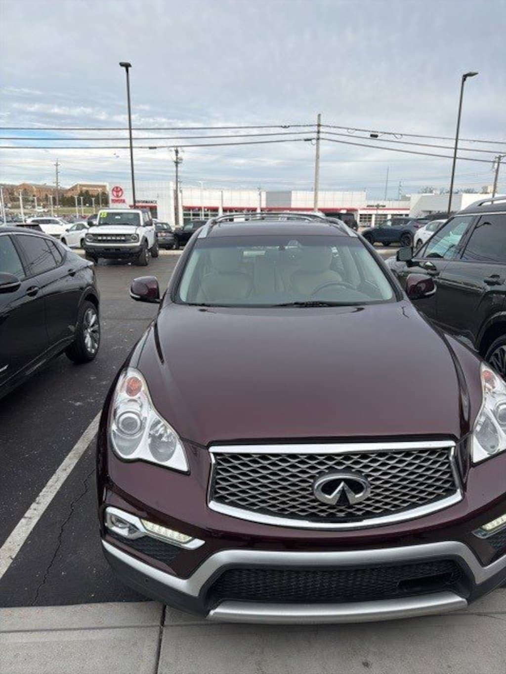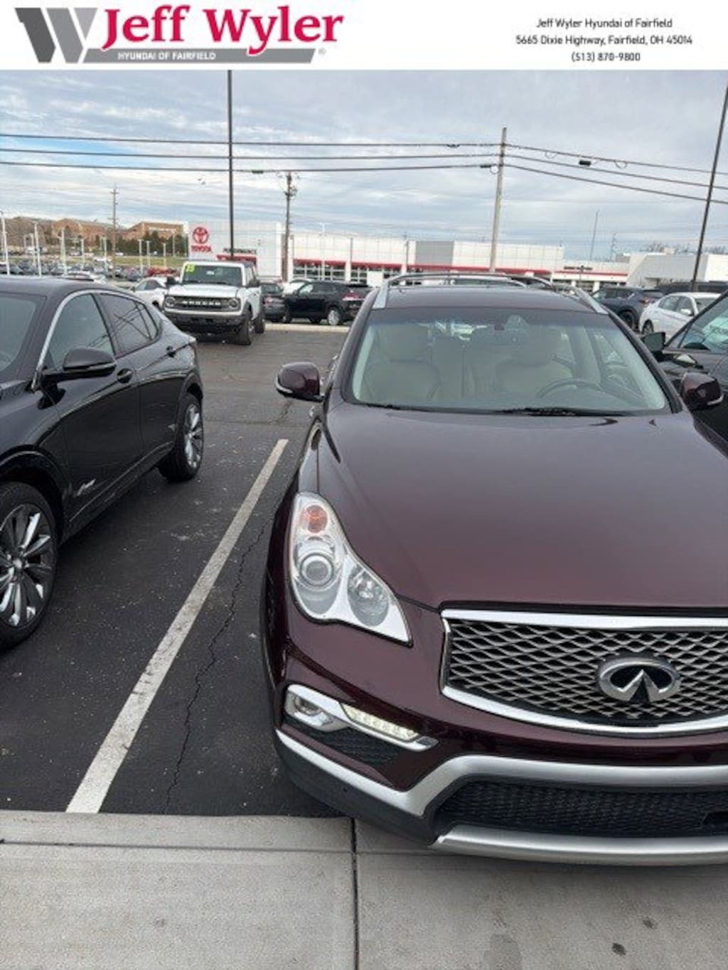 Clean CARFAX. Jeff Wyler Hyundai of Fairfield is excited to offer this good-looking 2017 INFINITI QX50 in Midnight Garnet. Well equipped with: Deluxe Touring Package (19" x 8.5" Split 5-Spoke Aluminum-Alloy Wheels, 2-Way Power Driver's Seat Lumbar Support, 8-Way Power Front-Passenger's Seat, Coat Hanger On Driver's Seat Head Restraint, High-Intensity Discharge Xenon Headlights, Power Up-Folding 2nd Row Seats, and Premium Stitching On Meter Hood), Premium Package (Advanced Climate Control System, Aluminum Roof Rails, Auto-Dimming Inside Mirror, Bose 11-Speaker Premium Audio System, Dual Occupant Memory System For Driver's Seat, HomeLink Universal Transceiver, Maple Interior Accents, Outside Mirrors w/Reverse Tilt-Down Feature, Power Tilt & Telescopic Steering Column, and Radio: AM/FM/CD/DVD w/MP3 Playback Capability), Premium Plus Package (Around View Monitor (AVM), INFINITI Navigation System, and Streaming Audio via Bluetooth Wireless Technology), Technology Package (Aluminum Pedals, Blind Spot Warning, Forward Collision Warning (FCW), Intelligent Brake Assist (IBA), Intelligent Cruise Control, and Lane Departure Warning System), Android Auto, Apple CarPlay, CALL NOW FOR YOUR VIP APPOINTMENT 513-870-9800, FULLY SERVICED w/RECORDS, GUARANTEED FINANCING!! NO MATTER YOUR SITUATION WE CAN GET AN APPROVAL!!, THE #1 Volume dealer in the region! Come see why for yourself Today!!, WE PAY MORE FOR YOUR TRADE!!, 3.133 Axle Ratio, 4-Wheel Disc Brakes, 6 Speakers, ABS brakes, Activation Disclaimer, Air Conditioning, Alloy wheels, AM/FM radio: SiriusXM, Anti-whiplash front head restraints, Automatic temperature control, Brake assist, Bumpers: body-color, CD player, Delay-off headlights, Driver door bin, Driver vanity mirror, Dual front impact airbags, Dual front side impact airbags, Electronic Stability Control, Four wheel independent suspension, Front anti-roll bar, Front Bucket Seats, Front Center Armrest, Front dual zone A/C, Front fog lights, Front reading lights, Heated door mirrors, Heated Front Bucket Seats, Heated front seats, Illuminated entry, Illuminated Kick Plates, Leather Shift Knob, Leather steering wheel, Leather-Appointed Seat Trim, Literature Kit, Low tire pressure warning, Occupant sensing airbag, Outside temperature display, Overhead airbag, Overhead console, Panic alarm, Passenger door bin, Passenger vanity mirror, Power door mirrors, Power driver seat, Power moonroof, Power passenger seat, Power steering, Power windows, Radio data system, Radio: AM/FM/CD w/6 Speaker Audio System, Rear anti-roll bar, Rear reading lights, Rear seat center armrest, Rear window defroster, Rear window wiper, Remote keyless entry, Roof Rail Crossbars, Security system, Speed control, Speed-sensing steering, Speed-Sensitive Wipers, Splash Guards (Set of 4), Split folding rear seat, Spoiler, Stainless Steel Look Rear Bumper Protector, Steering wheel mounted audio controls, Tachometer, Telescoping steering wheel, Tilt steering wheel, Traction control, Trip computer, Turn signal indicator mirrors, Variably intermittent wipers, and Wheels: 18" x 8.0" 8-Spoke Aluminum-Alloy. Reviews: * Powerful standard V6 engine; responsive handling more akin to a sport sedan than a sport-utility. Source: EdmundsTO CHECK ON THE AVAILABILITY OF THIS VEHICLE REACH OUT TO ONE OF OUR TEAM MEMBERS!! ALSO SHOP ONLINE AT https://www.jeffwylerhyundaioffairfield.com/ Proudly Serving: Cincinnati, Dayton, Columbus, Louisville, Lexington, Indianapolis, Hamilton, Florence, Alexandria, Beavercreek, Springdale, West Chester, Monroe, Fairfield, Kenwood, Newport and all of greater Cincinnati Ohio, Indiana, and Northern Kentucky.