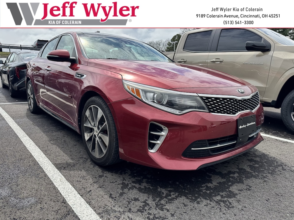 Jeff Wyler Kia of Colerain is very proud to offer this handsome 2016 Kia Optima SX in Remington Red Metallic. Paint Protection Film Package, Technology Package (10-Way Power Front Passenger Seat, Advanced Smart Cruise Control, Auto-Dimming Rear-View Mirror, Autonomous Emergency Braking (AEB), Bi-Xenon HID Headlights, Blind Spot Detection, Electronic Parking Brake, Front Collision Warning System, harman/kardon® Audio System, Heated & Ventilated Front Seats, Heated Rear Outboard Seats, Lane Departure Warning System, LED Overhead Front & Rear Reading Lamps, Panoramic Sunroof, Premium ESC, Rear Cross Traffic Alert, Rear Parking Assist System, Rear Side Window Sun Shades, and Wireless Charging System), 18" Machined Alloy Wheels, 4-Wheel Disc Brakes, 6 Speakers, 8" Navigation System, ABS brakes, Air Conditioning, Alloy wheels, AM/FM radio: SiriusXM, AM/FM/CD/MP3 Radio, Auto-dimming Rear-View mirror, Automatic temperature control, Brake assist, Bumpers: body-color, Cargo Hook, Cargo Mat, Cargo Net, Cargo Tray, Compass, Delay-off headlights, Driver door bin, Driver vanity mirror, Dual front impact airbags, Dual front side impact airbags, Electronic Stability Control, Exterior Parking Camera Rear, Four wheel independent suspension, Front anti-roll bar, Front Bucket Seats, Front Center Armrest, Front dual zone A/C, Front reading lights, Fully automatic headlights, Garage door transmitter: HomeLink, Heated door mirrors, Heated Front Bucket Seats, Heated front seats, Heated steering wheel, High intensity discharge headlights: Bi-Xenon, Illuminated entry, Knee airbag, Leather Seat Trim, Leather Shift Knob, Leather steering wheel, Low tire pressure warning, Memory seat, Navigation System, Occupant sensing airbag, Outside temperature display, Overhead airbag, Overhead console, Panic alarm, Passenger door bin, Passenger vanity mirror, Power door mirrors, Power driver seat, Power steering, Power windows, Rear anti-roll bar, Rear Camera Display, Rear reading lights, Rear seat center armrest, Rear window defroster, Remote keyless entry, Security system, Speed control, Speed-sensing steering, Split folding rear seat, Spoiler, Sport steering wheel, Steering wheel mounted audio controls, Tachometer, Telescoping steering wheel, Tilt steering wheel, Traction control, Trip computer, Turn signal indicator mirrors, and Variably intermittent wipers Our PRE-OWNED vehicles are put through a rigorous 167- POINT QUALITY ASSURANCE INSPECTION along with an average amount of over $1,400.00 SPENT to recondition each vehicle so we can be sure to deliver you the highest quality vehicle like you deserve! ***ONLINE PRICE DOES NOT INCLUDE WYLER FAMILY FIRST PACKAGE***