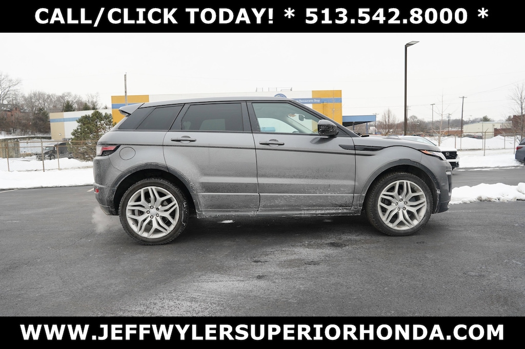 Jeff Wyler Superior Honda is pumped up to offer this charming 2017 Land Rover Range Rover Evoque HSE Dynamic in Kaikoura Stone Metallic. BLUETOOTH, LEATHER, and MOONROOF SUNROOF Range Rover Evoque HSE Dynamic, 4D Sport Utility, 2.0L Turbocharged, 9-Speed Automatic, 4WD, Kaikoura Stone Metallic, Ebony/Ebony Leather, 11 Speakers, 12-Way Heated Dynamic Style Front Sport Seats, 3.75 Axle Ratio, 4-Wheel Disc Brakes, ABS brakes, Adaptive suspension, Air Conditioning, Alloy wheels, AM/FM radio, Auto High-beam Headlights, Auto-dimming Rear-View mirror, Automatic temperature control, Brake assist, Bumpers: body-color, CD player, Delay-off headlights, Driver door bin, Driver vanity mirror, Dual front impact airbags, Dual front side impact airbags, Electronic Stability Control, Emergency communication system: InControl Protect, Exterior Parking Cameras, Four wheel independent suspension, Front anti-roll bar, Front Bucket Seats, Front Center Armrest, Front dual zone A/C, Front fog lights, Front reading lights, Fully automatic headlights, Garage door transmitter: HomeLink, Headlight cleaning, Heated door mirrors, Heated front seats, High intensity discharge headlights: Xenon, Illuminated entry, Knee airbag, Leather steering wheel, Low tire pressure warning, Memory seat, Navigation System, Occupant sensing airbag, Outside temperature display, Overhead airbag, Oxford Leather w/Perforated Mid-Section Seat Trim, Panic alarm, Passenger door bin, Passenger vanity mirror, Power door mirrors, Power driver seat, Power Liftgate, Power passenger seat, Power steering, Power windows, Premium audio system: Meridian, Radio data system, Radio: InControl Touch Pro w/Navigation, Rain sensing wipers, Rear anti-roll bar, Rear fog lights, Rear reading lights, Rear seat center armrest, Rear window defroster, Rear window wiper, Remote keyless entry, Security system, Speed control, Speed-sensing steering, Speed-Sensitive Wipers, Split folding rear seat, Spoiler, Steering wheel mounted audio controls, Tachometer, Telescoping steering wheel, Tilt steering wheel, Traction control, Trip computer, Turn signal indicator mirrors, Variably intermittent wipers, and Wheels: 19" 7-Split Spoke Alloy w/Sparkle Finish Our PRE-OWNED vehicles are put through a rigorous 167- POINT QUALITY ASSURANCE INSPECTION along with an average amount of over $1,400.00 SPENT to recondition each vehicle so we can be sure to deliver you the highest quality vehicle like you deserve! ***ONLINE PRICE DOES NOT INCLUDE WYLER FAMILY FIRST PACKAGE*** Stop by 4777 Spring Grove Ave. Road to see for yourself, or give us a call @ 283-209-1858 to schedule your test drive!Vehicle pricing includes all offers and incentives. Due to limited inventory, offers and pricing are all subject to change. Tax, Title, Tags and $387 doc fees are not included in vehicle price shown and must be paid by the purchaser. Doc fees vary by location. Financing w/approved credit. Mileage est. Based on current EPA estimates reflecting new EPA methods beginning w/ 2008 models. For comparison only. Do not compare to pre 2008 models. Actual mileage may vary based on how you drive and maintain your vehicle. Information on this site includes 3rd party data believed to be reliable, subject to change without notice. Jeff Wyler reserves the right to correct any errors and/or omissions in the compilation or presentation of this data and makes no representations express or implied to any prospective purchaser as to the vehicle's condition, specifications, history, equipment or equipment function, price or warranties. This vehicle may be subject to an open recall that has not been repaired. Please consult safercar.gov for more information on the current status. It is the responsibility of purchaser to confirm any data prior to purchase. Other than MSRP, all offers only apply to this vehicle and are subject to change. Vehicle prices are subject to change and all vehicles are subject to prior sale and may not be available when you are ready to