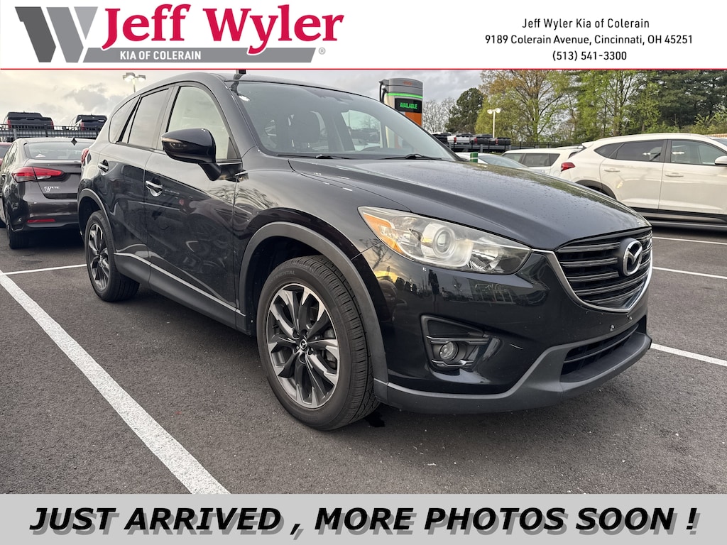 Jeff Wyler Kia of Colerain is delighted to offer this gorgeous 2016 Mazda CX-5 Grand Touring in Jet Black Mica. 19 x 7J Aluminum Alloy Wheels, 4-Wheel Disc Brakes, 4.62 Axle Ratio, 9 Speakers, ABS brakes, Air Conditioning, Alloy wheels, AM/FM radio: SiriusXM, Automatic temperature control, Bose 9-Speaker Audio Sound System, Brake assist, Bumpers: body-color, CD player, Delay-off headlights, Driver door bin, Driver vanity mirror, Dual front impact airbags, Dual front side impact airbags, Electronic Stability Control, Emergency communication system: Mazda Connect, Exterior Parking Camera Rear, Four wheel independent suspension, Front anti-roll bar, Front Bucket Seats, Front Center Armrest, Front dual zone A/C, Front fog lights, Front reading lights, Fully automatic headlights, Heated door mirrors, Heated front seats, Heated Front Sport Shape Seats, Illuminated entry, Leather Seat Trim, Leather Shift Knob, Low tire pressure warning, Navigation System, Occupant sensing airbag, Outside temperature display, Overhead airbag, Overhead console, Panic alarm, Passenger door bin, Passenger vanity mirror, Power door mirrors, Power driver seat, Power moonroof, Power steering, Power windows, Radio data system, Radio: AM/FM/CD/HD Modular Audio System w/Bose, Rain sensing wipers, Rear anti-roll bar, Rear reading lights, Rear seat center armrest, Rear window defroster, Rear window wiper, Remote keyless entry, Speed control, Speed-sensing steering, Split folding rear seat, Spoiler, Steering wheel mounted audio controls, Tachometer, Telescoping steering wheel, Tilt steering wheel, Traction control, Trip computer, Turn signal indicator mirrors, and Variably intermittent wipers Our PRE-OWNED vehicles are put through a rigorous 167- POINT QUALITY ASSURANCE INSPECTION along with an average amount of over $1,400.00 SPENT to recondition each vehicle so we can be sure to deliver you the highest quality vehicle like you deserve! ***ONLINE PRICE DOES NOT INCLUDE WYLER FAMILY FIRST PACKAGE***