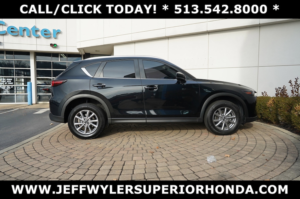 Jeff Wyler Superior Honda is honored to offer this stunning-looking 2023 Mazda CX-5 2.5 S Select Package in Jet Black Mica. BLUETOOTH, LEATHER, MOONROOF SUNROOF, and ONE OWNER CX-5 2.5 S Select Package, 4D Sport Utility, SKYACTIV® 2.5L 4-Cylinder DOHC 16V, 6-Speed Automatic, AWD, Jet Black Mica, Black Artificial Leather, 4-Wheel Disc Brakes, 4.624 Axle Ratio, 6 Speakers, ABS brakes, Air Conditioning, Alloy wheels, AM/FM radio, AppLink/Apple CarPlay and Android Auto, Auto High-beam Headlights, Automatic temperature control, Brake assist, Bumpers: body-color, Delay-off headlights, Driver door bin, Driver vanity mirror, Dual front impact airbags, Dual front side impact airbags, E911 Automatic Emergency Notification, Electronic Stability Control, Emergency communication system: MAZDA CONNECT, Exterior Parking Cameras, Four wheel independent suspension, Front anti-roll bar, Front Bucket Seats, Front Center Armrest w/Storage, Front dual zone A/C, Front reading lights, Fully automatic headlights, Heated Front Bucket Seats, Heated front seats, Illuminated entry, Infotainment System Voice Command, Leather Shift Knob, Leatherette Seat Trim, Low tire pressure warning, Multifunction Commander Control, Occupant sensing airbag, Outside temperature display, Overhead airbag, Overhead console, Pandora, Panic alarm, Passenger door bin, Passenger vanity mirror, Power door mirrors, Power driver seat, Power steering, Power windows, Radio Broadcast Data System Program Information, Radio data system, Radio: AM/FM/HD Audio System, Rain sensing wipers, Rear anti-roll bar, Rear reading lights, Rear seat center armrest, Rear window defroster, Rear window wiper, Remote keyless entry, Roof Rack Side Rails, SMS Text Msg Audio Delivery & Reply, Speed control, Speed-sensing steering, Split folding rear seat, Spoiler, Steering wheel mounted audio controls, Tachometer, Telescoping steering wheel, Tilt steering wheel, Traction control, Trip computer, Turn signal indicator mirrors, Variably intermittent wipers, and Wheels: 17" x 7J Aluminum Alloy Our PRE-OWNED vehicles are put through a rigorous 167- POINT QUALITY ASSURANCE INSPECTION along with an average amount of over $1,400.00 SPENT to recondition each vehicle so we can be sure to deliver you the highest quality vehicle like you deserve! ***ONLINE PRICE DOES NOT INCLUDE WYLER FAMILY FIRST PACKAGE*** Stop by 4777 Spring Grove Ave. Road to see for yourself, or give us a call @ 283-209-1858 to schedule your test drive!